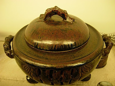 These electric braziers by Lee Qwang are a step away from the earthy puncheongwear usually found on this blog. His use of thick, ultra shiny glazes are a treat for the eyes. His braziers all contain lids which cover the heating coils when not in use. The greenish glazed braziers contain a lotus motif where the brown glazes contain a woody motif. Staring at them, you simply get lost in the glaze.